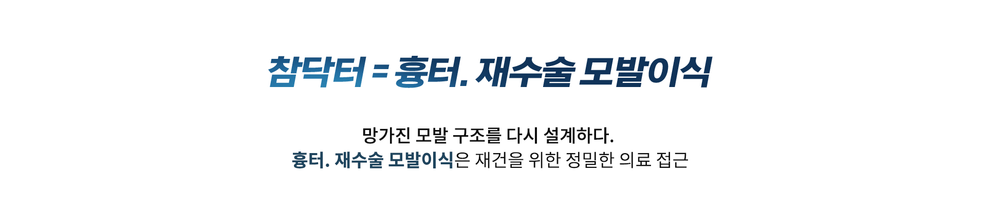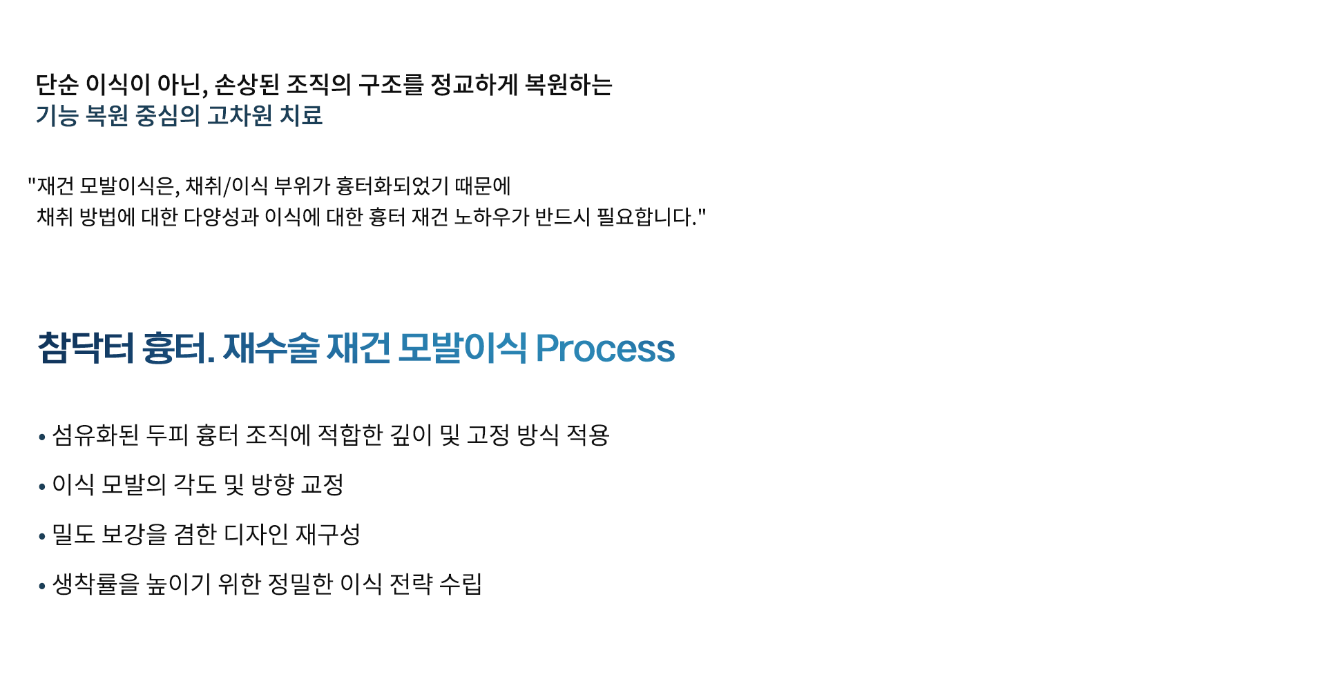"재건 모발이식은, 채취/이식 부위가 흉터화되었기 때문에 채취 방법에 대한 다양성과 이식에 대한 흉터 재건 노하우가 반드시 필요합니다."